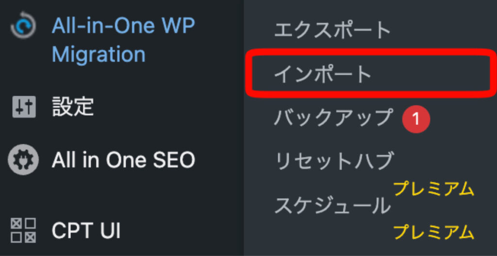 有効化すると、管理画面にAll in One WP Migrationのメニューが出てきます。