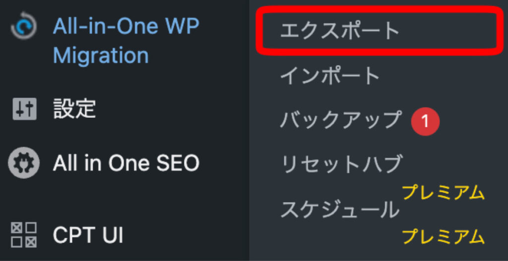 管理画面のAll in One WP Migrationのメニューから「エクスポート」を選択。