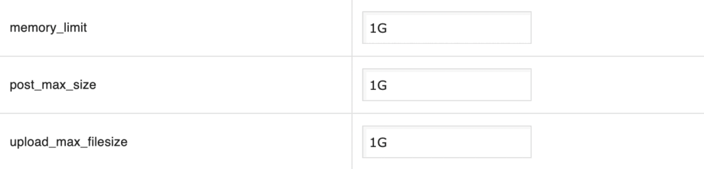 memory_limit、post_max_size、upload_max_filesizeの3つの容量の値を変更しましょう。