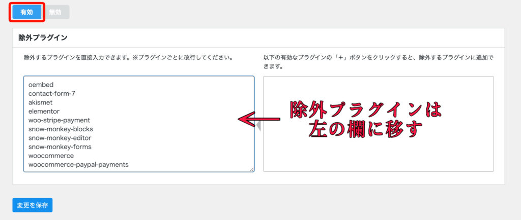 そういったプラグインは「除外プラグイン」欄に追加する必要があります。