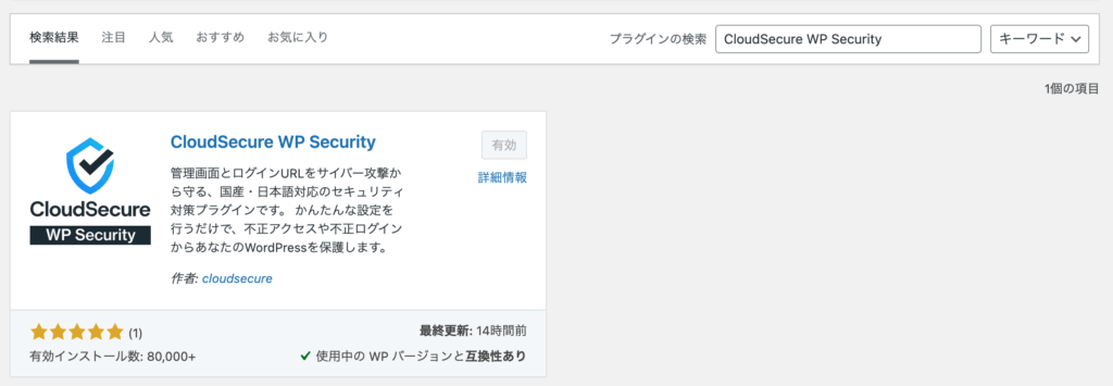 そして検索ボックスに「CloudSecure WP Security」と打ち込み、下の画像のようなプラグインをインストール・有効化しましょう。