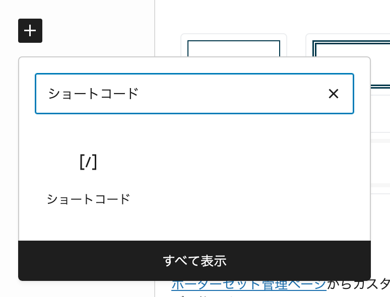 本文の箇所にて、ブロックエディターの+ボタンからショートコードを選択します。