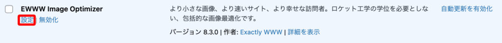 有効化ができたら、「インストール済みプラグイン」にEWWW Image Optimizerが表示されますので「設定」を選択します。