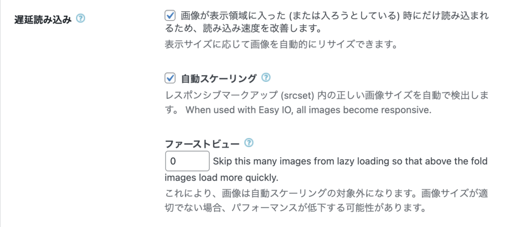 先ほどWebp化を行った人は、そのすぐ上に遅延読み込みの項目があります。