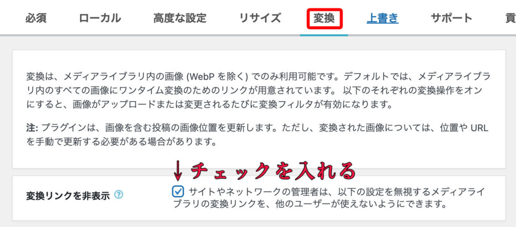 EWWW Image Optimizerでjpegやpng画像をWebpに変換するには、必須タブの中にある「Webp変換」という項にチェックを入れるだけです。
