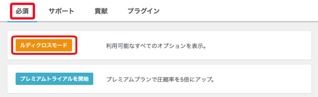 メニューの「必須」タブから「ルディクロスモード」を選択します。