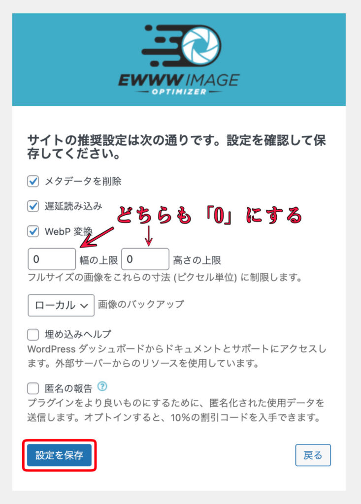 画面が切り替わったら、幅の上限と高さの上限を0に変更します。それ以外はデフォルト値で「設定を保存」をクリック。