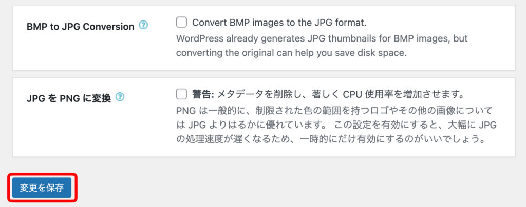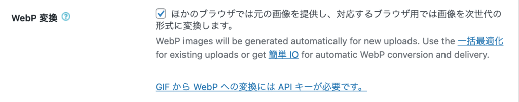 ここにチェックを入れて「変更を保存」を選択すれば、対応ブラウザでWebp化されます。