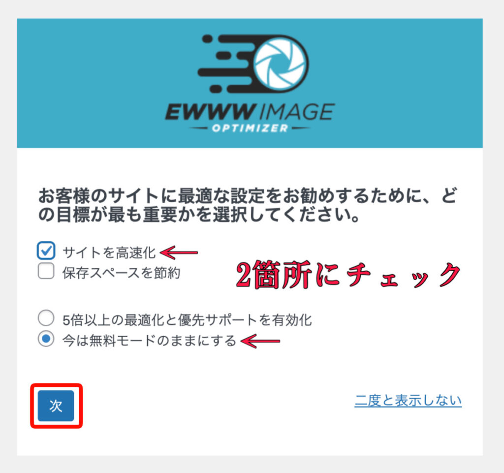 画面が切り替わったら、「サイト高速化」と「今は無料モードのままにする」にの2つにチェックを入れ、「次」をクリックします。
