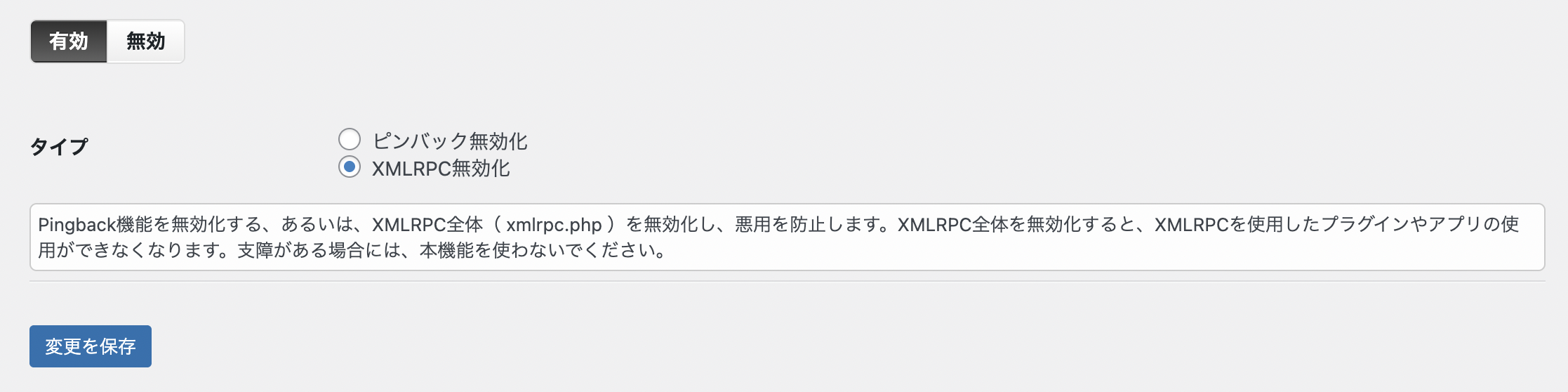 もし無効の状態になっている人は有効に切り替え、「XML-RPC無効」を選択して保存しましょう。