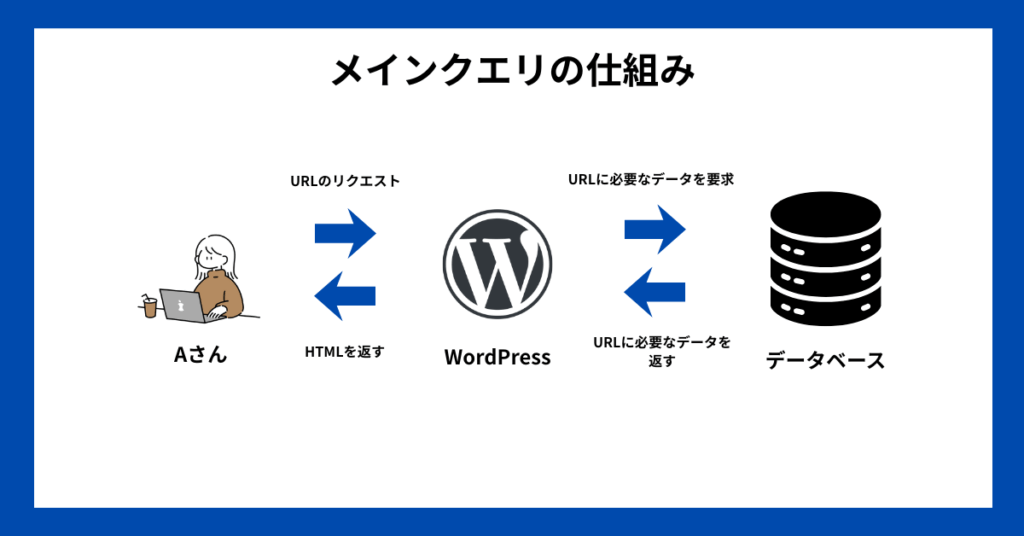 例えば、WordPressの記事の情報を1つ取ってくきて表示する際にも、今説明したメインクエリの流れで取得するわけですが